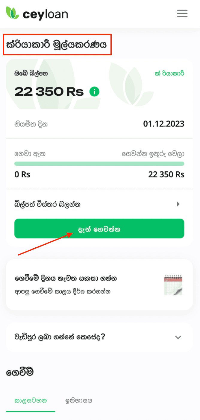 ඔබගේ Ceyloan ගිණුමට ගොස් "ක්රියාකාරී මූල්යකරණය" පිටුව විවෘත කරන්න. ඊළඟට, පහත "දැන් ගෙවන්න" බොත්තම ක්ලික් කරන්න: